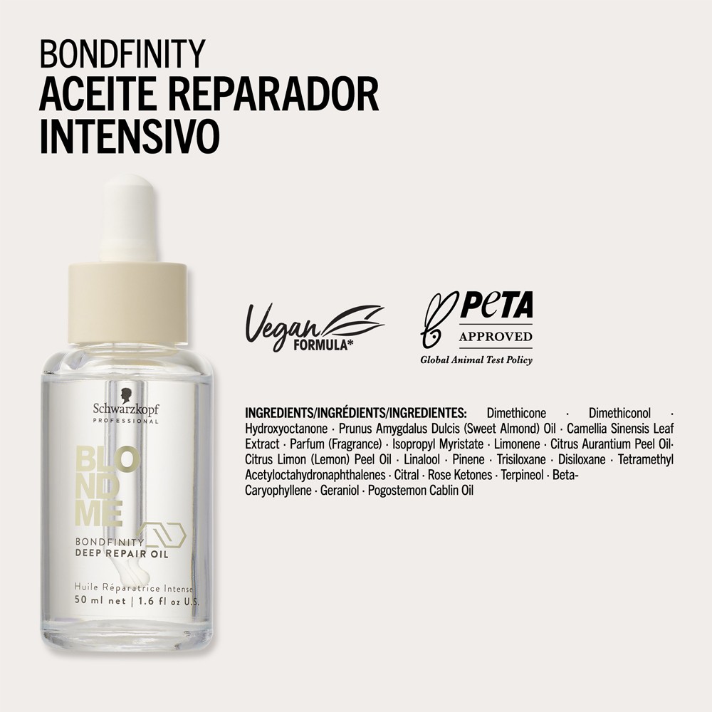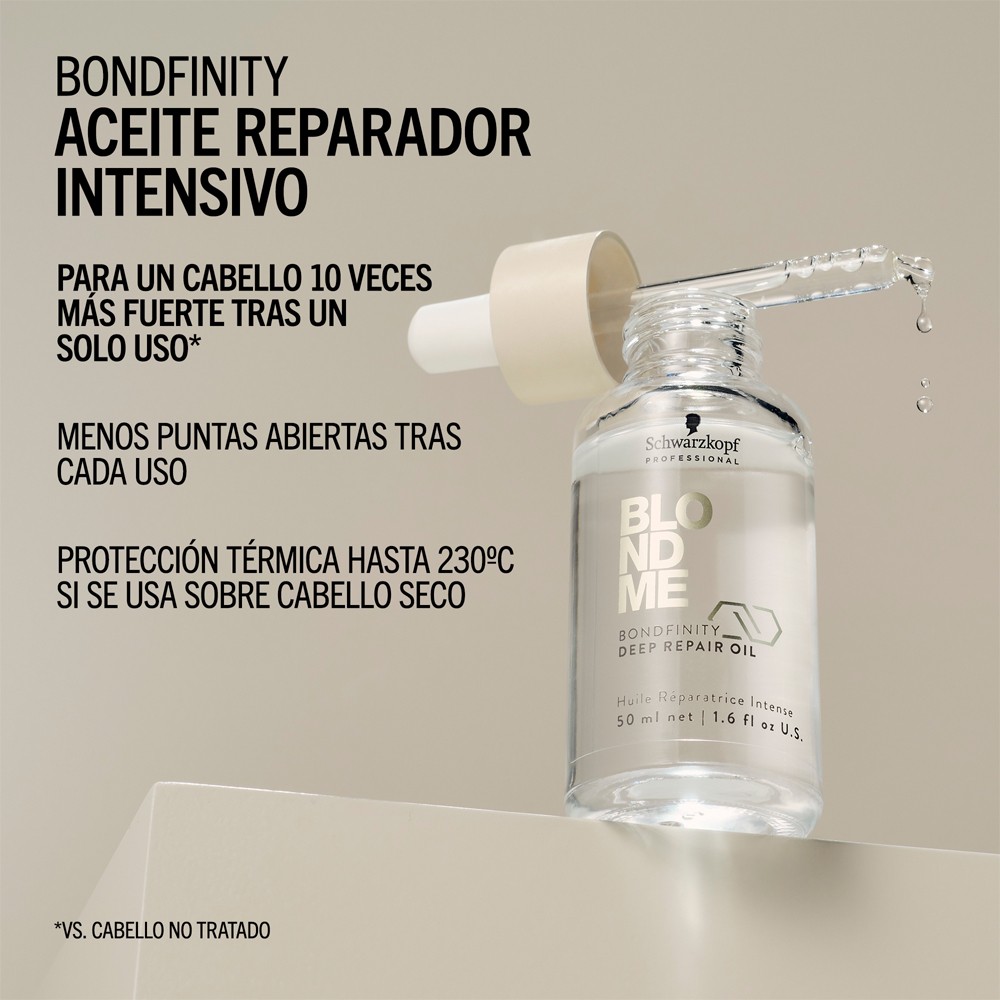 Aceite reparador intensivo que repara en profundidad y fortifica el cabello rubio y aclarado sin apelmazarlo, devuelve el aspecto sano al cabello creando puentes resistentes y sellando la propia queratina del cabello para una reparación proactiva y permanente con un cabello 20 veces más fuerte tras solo un uso.